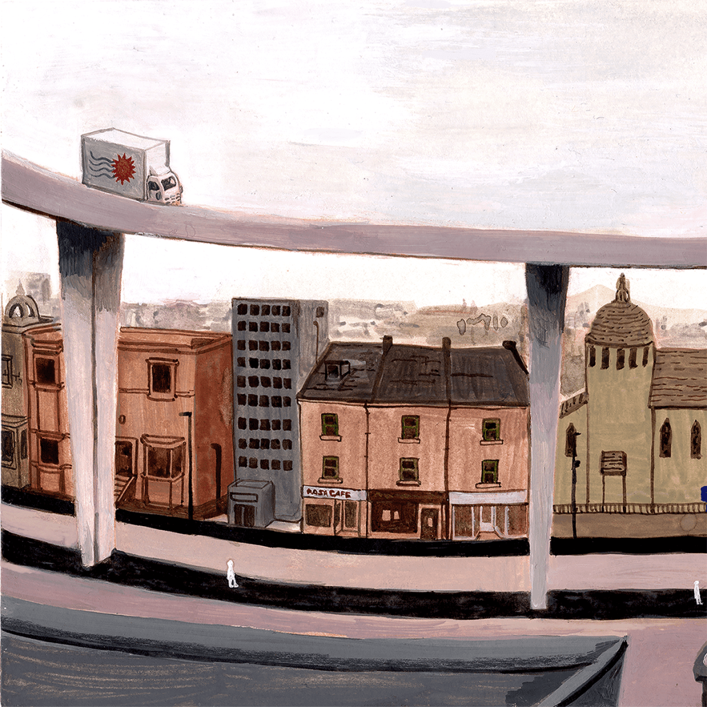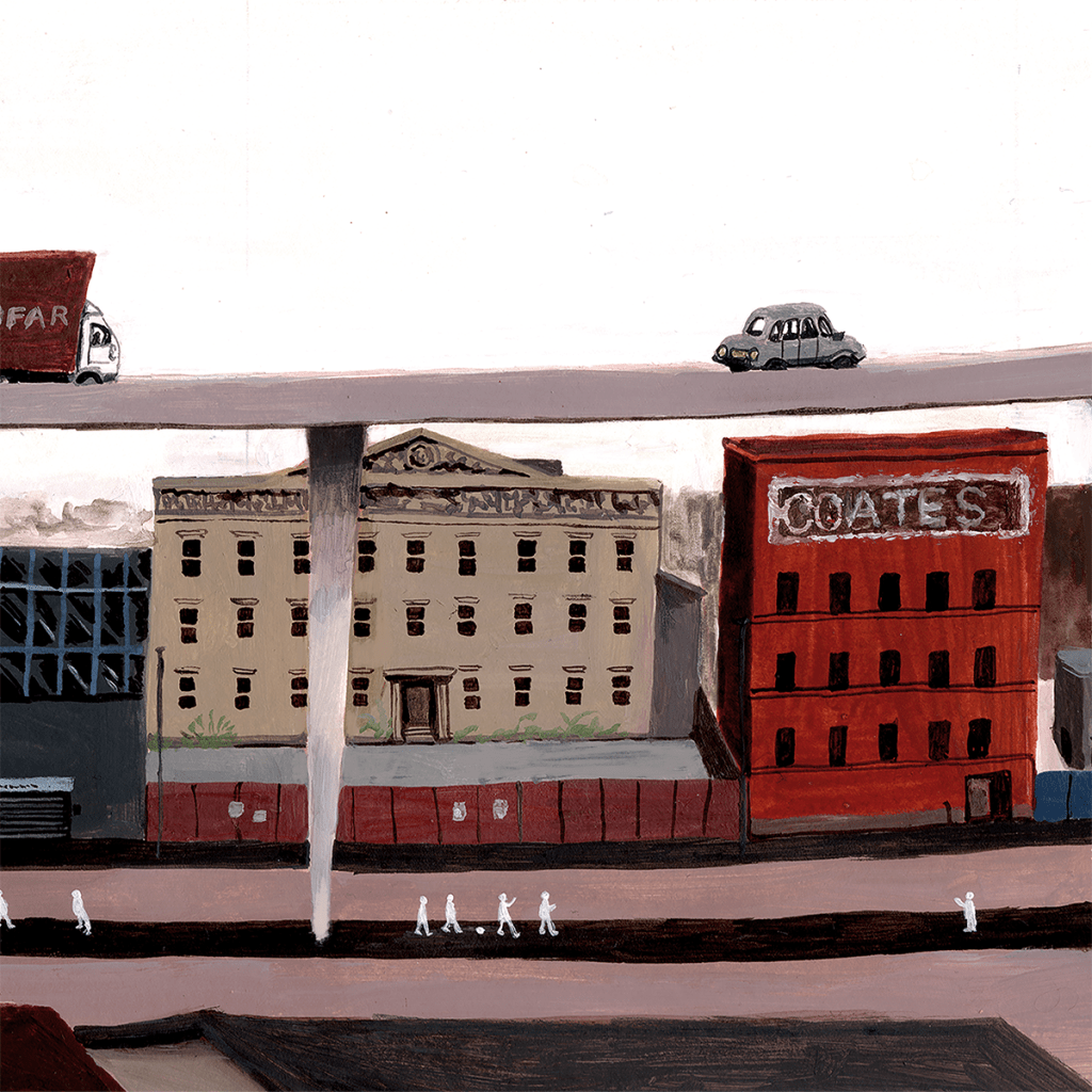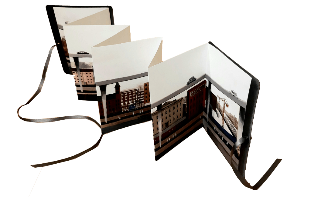 This book was completed as a project for my master’s course. My research involved taking walks down the section of motorway that runs from the city centre to the River Clyde. Eventually, I produced a concertina book that displays a narrative about a group of friends meeting up under the motorway, as well as a larger story about urban spaces.