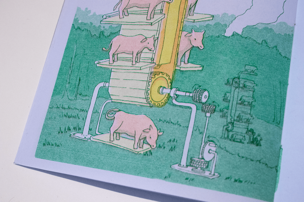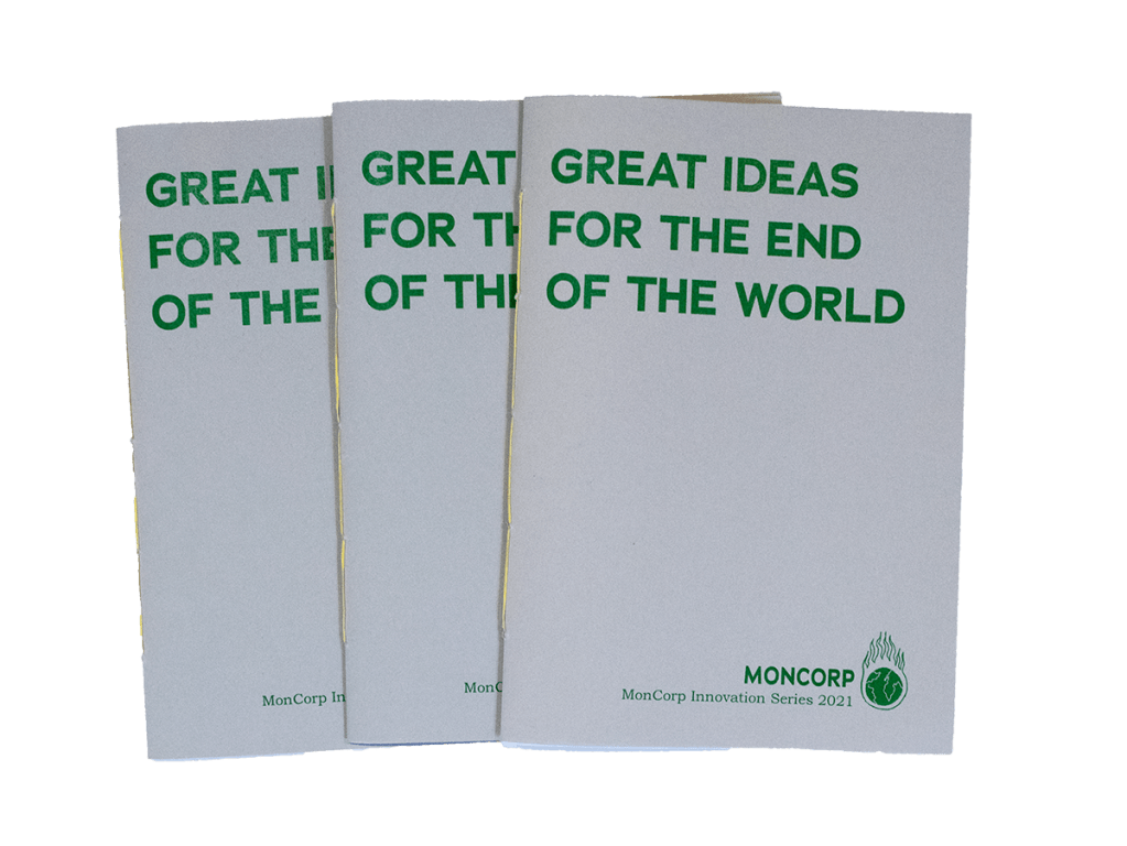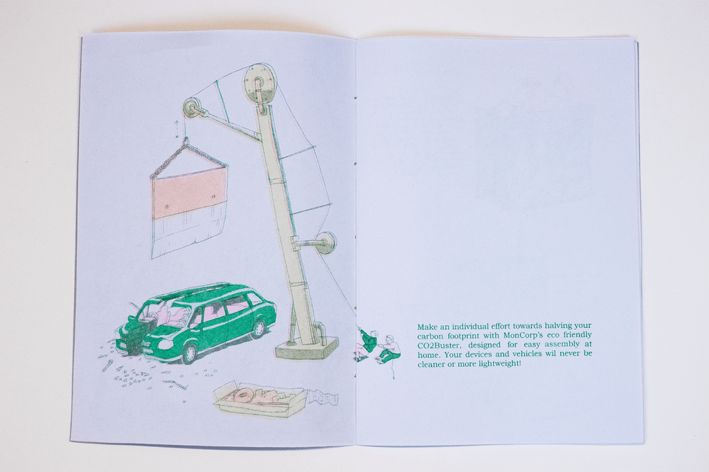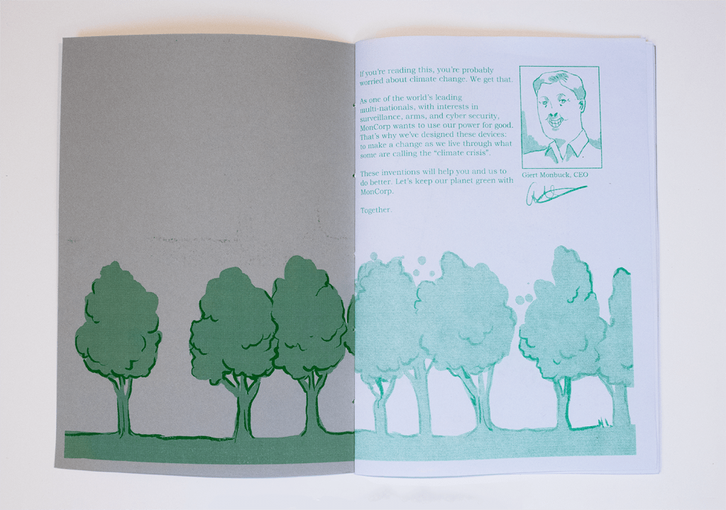 This publication was developed as a response to the COP26 conference in 2021. Associated with the fictional corporate entity MonCorp, the book showcases several devices which would supposedly solve climate change. The inventions are all too outlandish to be useful, and expressed my own feelings of helplessness against the climate crisis.